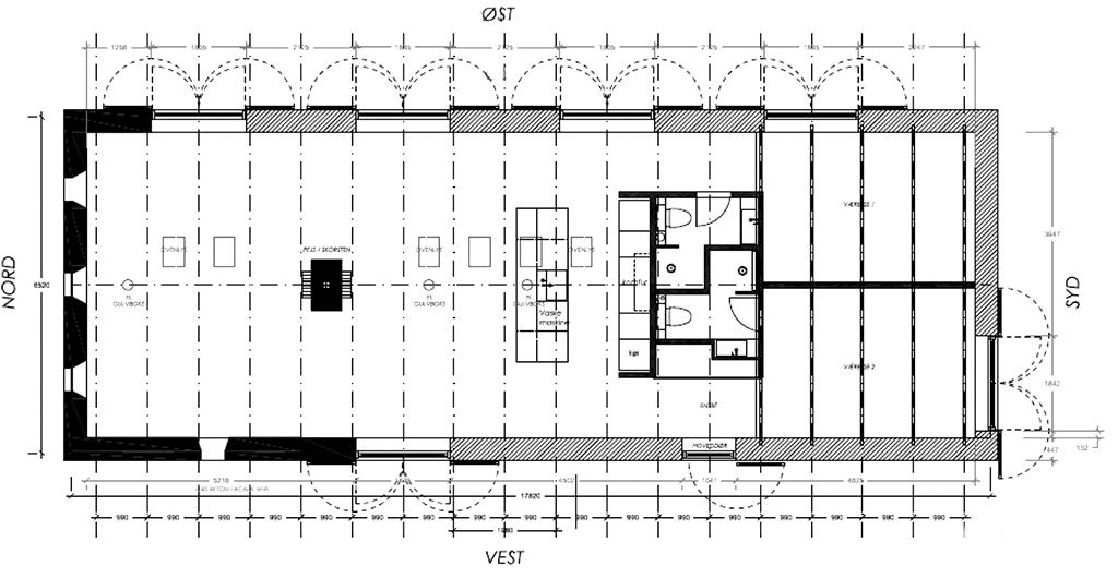 Plantegning af huset, hvor man tydligt ser at indretningen ikke længere ligner et bondehus fra 1897, men nærmere en modernistisk bolig fra 1960erne. Der er lagt vægt på at skabe et stort åbent rum, der hvor livet leves (køkken-alrum), mens de mere private soverum er trukket ned i husets sydlige ende.
