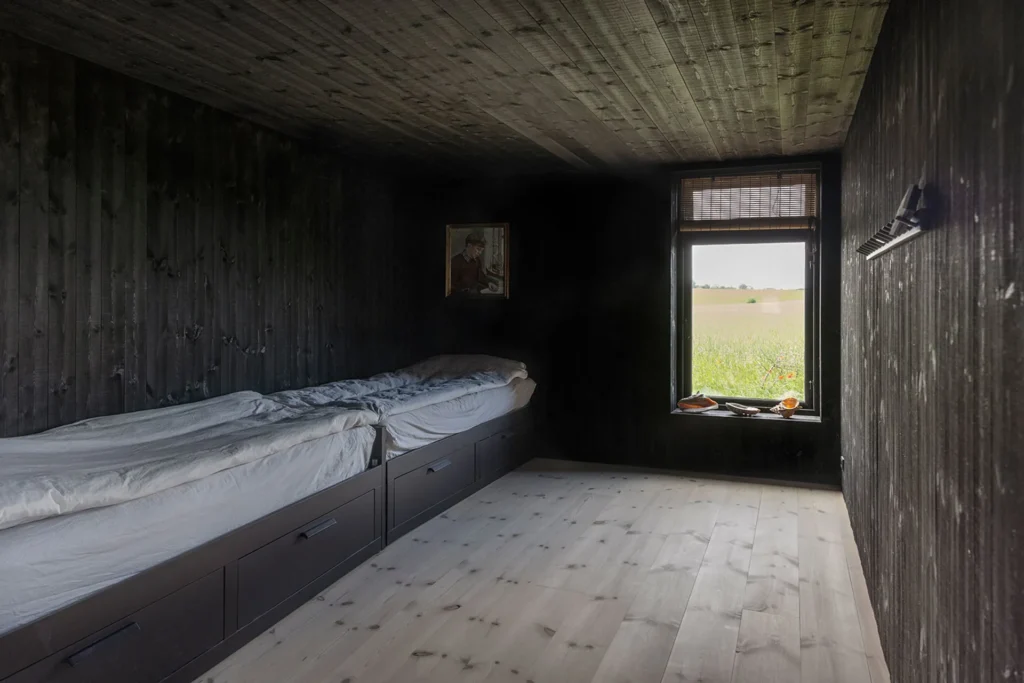 Den mørke hulefornemmelse doseres, så husets private rum er de mørkeste. Det giver en tryghedsfornemmelse og samtidig rettes blikket ud mod landskabet udenfor. Næsten som i et kamerahus, hvor lyset og omgivelserne kun slipper ind gennem linsen.